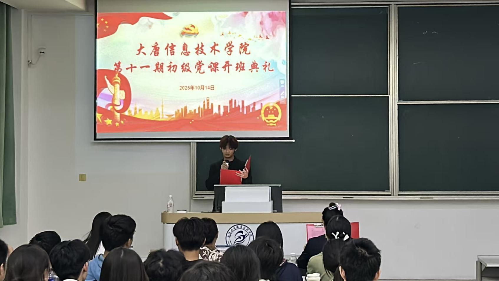 为深入学习贯彻习近平新时代中国特色社会主义思想,切实加强青年学生的理想信念教育和政治引领,2025年10月14日下午16时10分,大唐信息技术学院第十一期初级党课开班仪式在17-211教室隆重举行。学院党总支书记王丽茹、党总支副书记陈嘉玲、党总支组织委员张晗等老师出席仪式,与全体初党学员共同见证这一庄严时刻。开班仪式由大唐信息技术学院学生会组织部部长束雨笑主持。