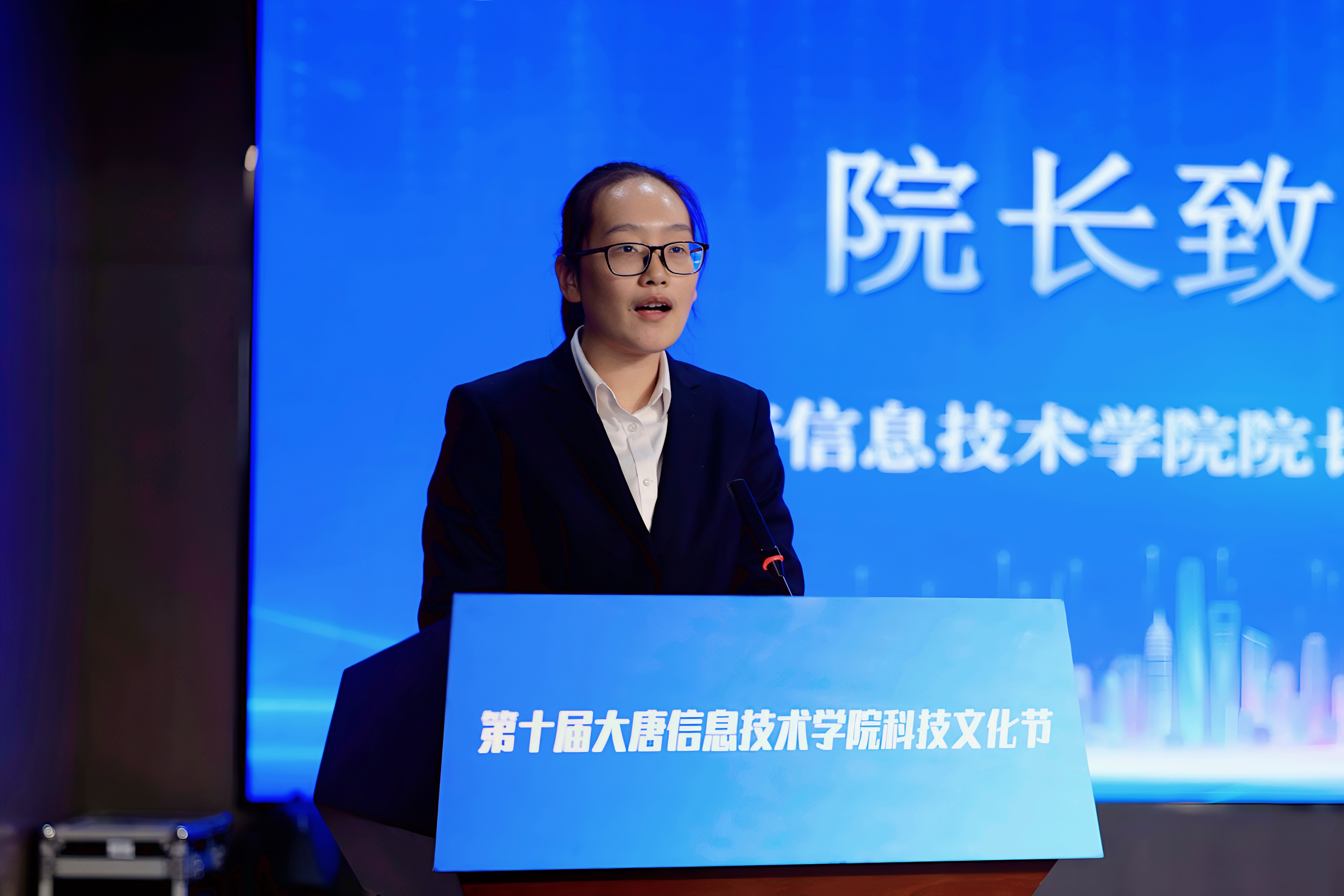 大唐信息技术学院院长俞蝶琼为第十届科技文化节致辞,她指出科技发展离不开两种精神:一是“精工”,即严谨认真的工匠精神,好比是大厦的地基;二是“科创”,即面向未来的创新梦想,好比是引领方向的旗帜。她勉励同学们,要拥抱新时代的科技浪潮,把扎实的专业知识和灵活的想象力结合起来,在IT领域多动手、多动脑,争取把学到的本领,变成真正能服务社会、建设国家的成果。