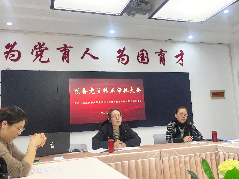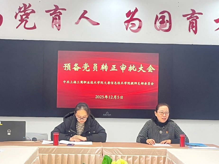2025年12月5日下午,大唐信息技术学院教师党支部在17号楼504会议室召开了预备党员转正审批大会。大会由大唐信息技术学院教师党支部书记俞蝶琼主持,大唐信息技术学院党总支书记王丽茹及教师党支部全体党员共同参加。