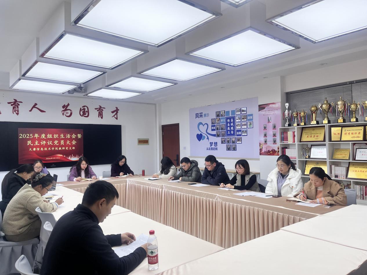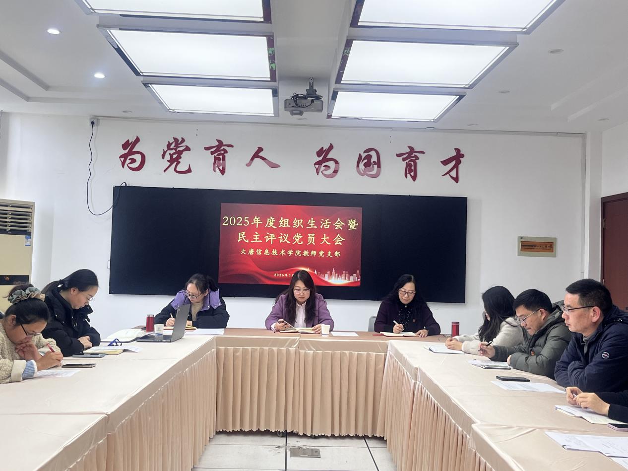 为深入学习贯彻习近平新时代中国特色社会主义思想,全面贯彻落实党的二十届四中全会精神,3月19日下午,大唐信息技术学院教师党支部召开2025年度组织生活会暨民主评议党员大会。本次会议以"检视剖析促整改,砥砺奋进启新程"为主题,通过严肃认真的党内政治生活,推进支部作风建设常态化长效化。会议由支部书记俞蝶琼主持,党总支书记王丽茹列席,校党委副书记、副校长、工会主席张中美莅临指导。