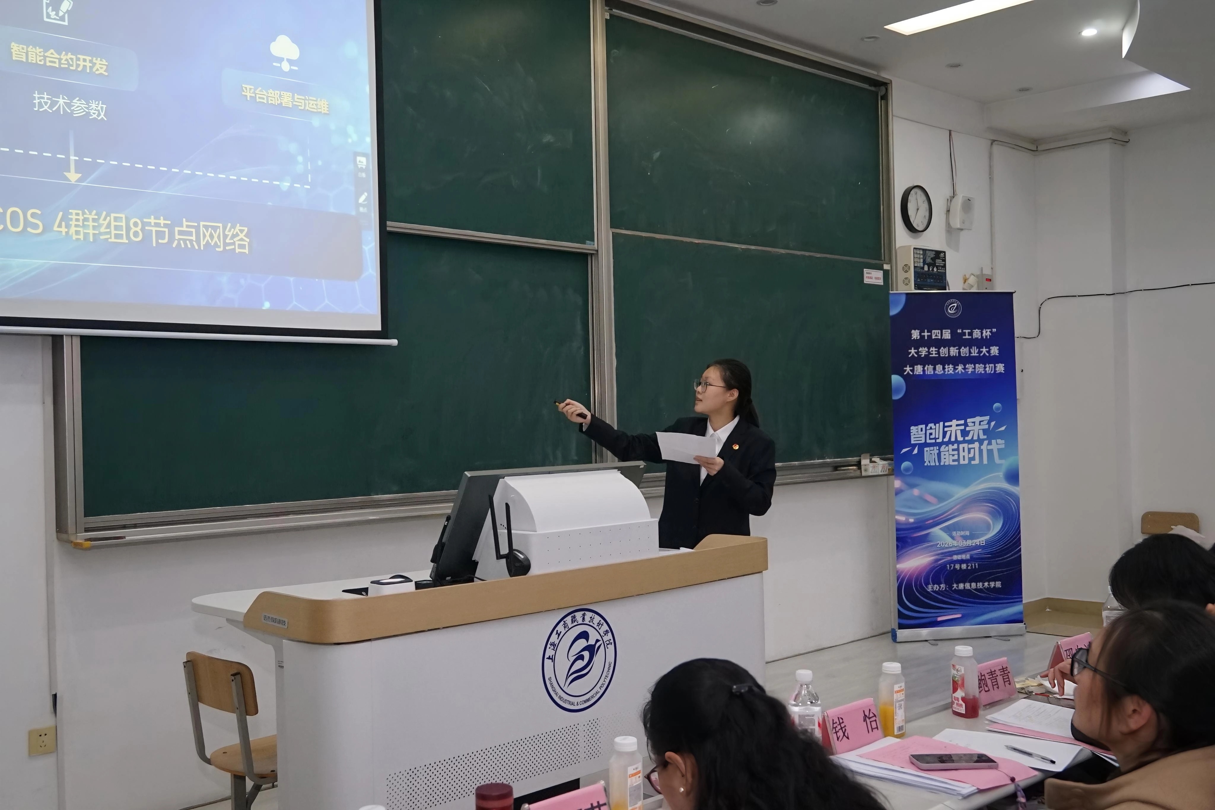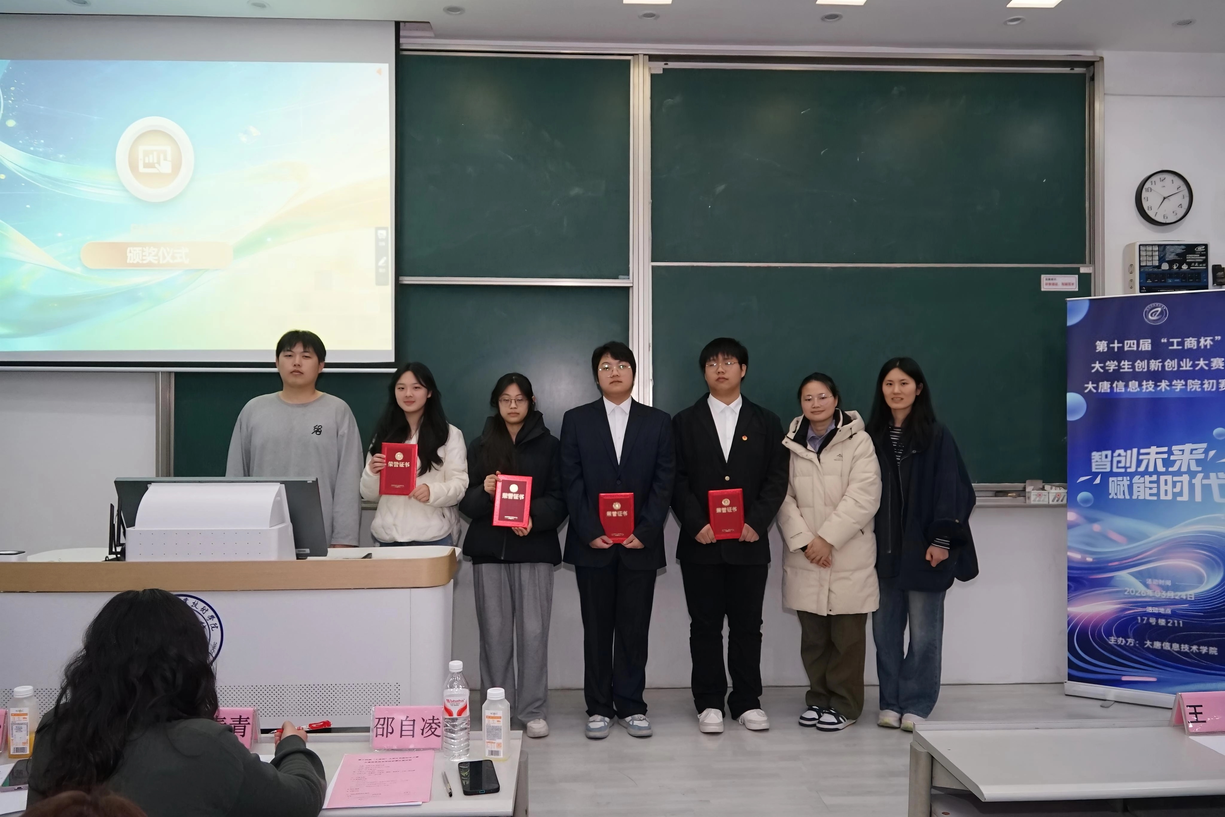 为进一步激发大学生创新思维与创业热情,提升他们的实践能力与综合素养,搭建创新创业交流展示与实践锻炼平台,2026 年 3 月 24 日 17:00,第十四届 “工商杯” 大学生创新创业大赛大唐信息技术学院初赛在17 号楼 211 教室如期举行。出席本次比赛的评委老师有大唐信息技术学院院长俞蝶琼,大唐信息技术学院党总支书记王丽茹,创新创业学院教师钱怡、鲍青青,创新创业工作室负责人王卉、专业教师陈向露、马平、校外创业指导教师邵自凌,以及到场观赛的各位老师和同学们。