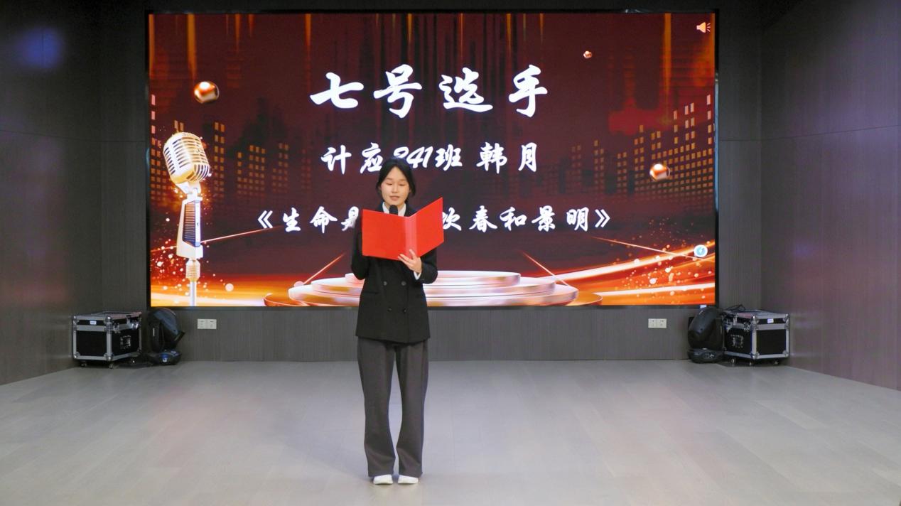 为了进一步丰富校园文化生活,营造积极向上、充满活力的校园氛围,着力提升学生的语言表达综合素养,促进学生综合素质的全面发展。2026年3月26日下午4时30分,大唐信息技术学院在嘉定校区新报告厅举办“以声逐梦,语你同行”第十一届“金话筒”主持人大赛初赛。本场比赛由大唐信息技术学院党总支书记王丽茹、党总支副书记陈嘉玲、团委书记张晗、IT生涯工作室负责人王卉、思政矩阵负责人朱睿担任评委,为选手们提供指导与点评。大赛共设置自我介绍、稿件展示、模拟主持三个环节,全面考察选手的语言功底、舞台表现力与临场应变能力。本场比赛由计应241班朱顺颖主持。